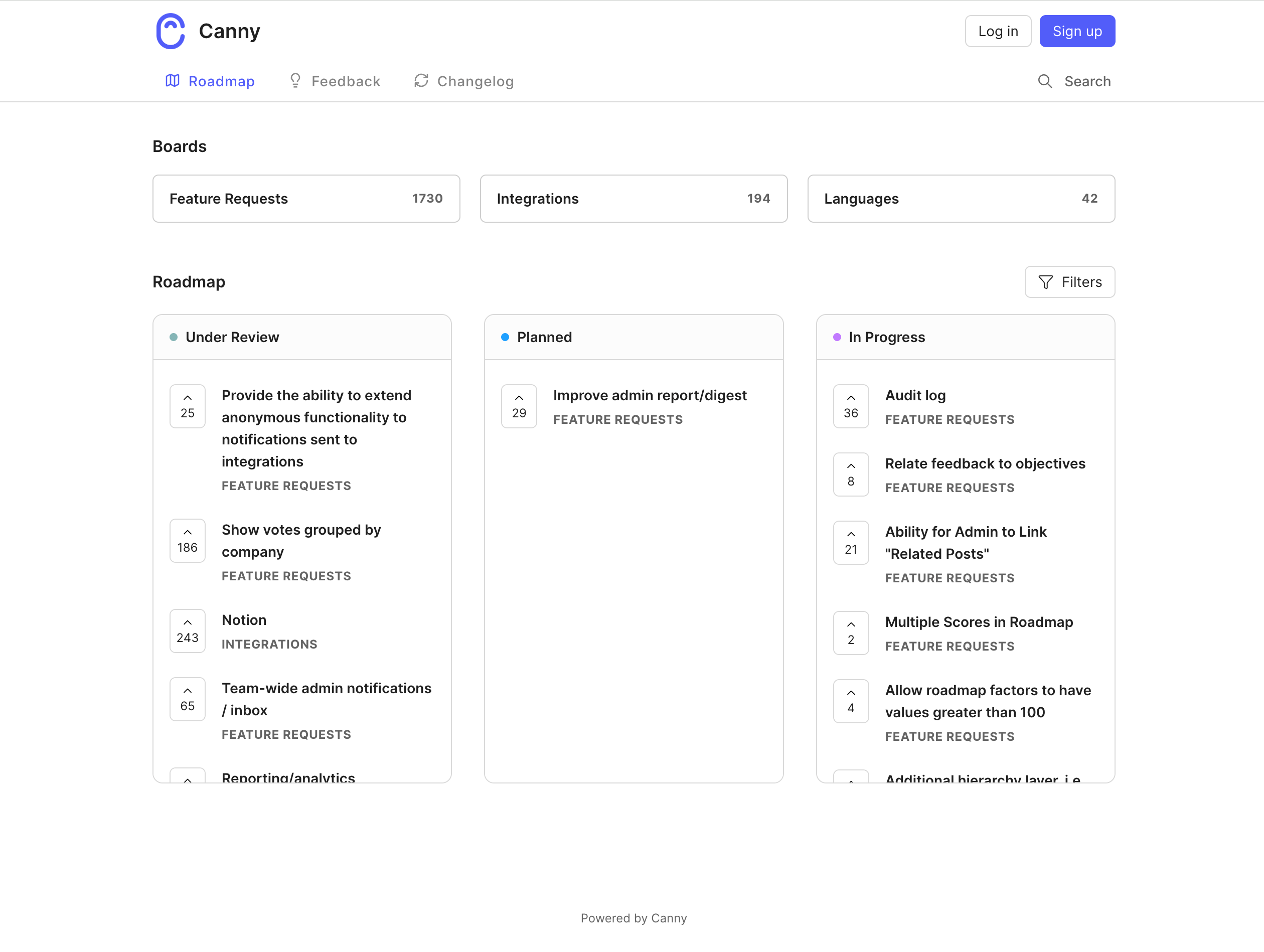 - Increasing user engagement via public/private boards, roadmaps, and changelogs