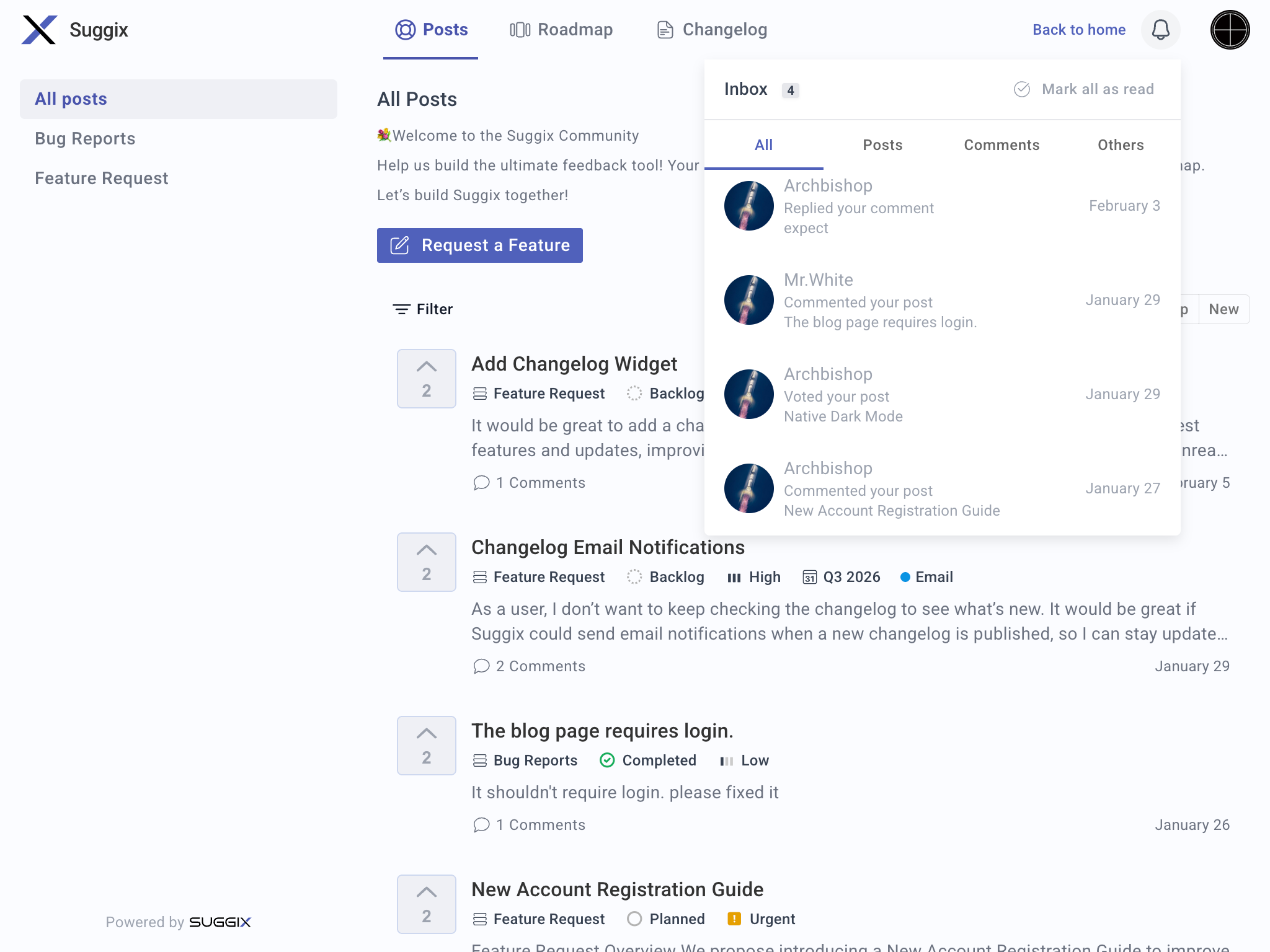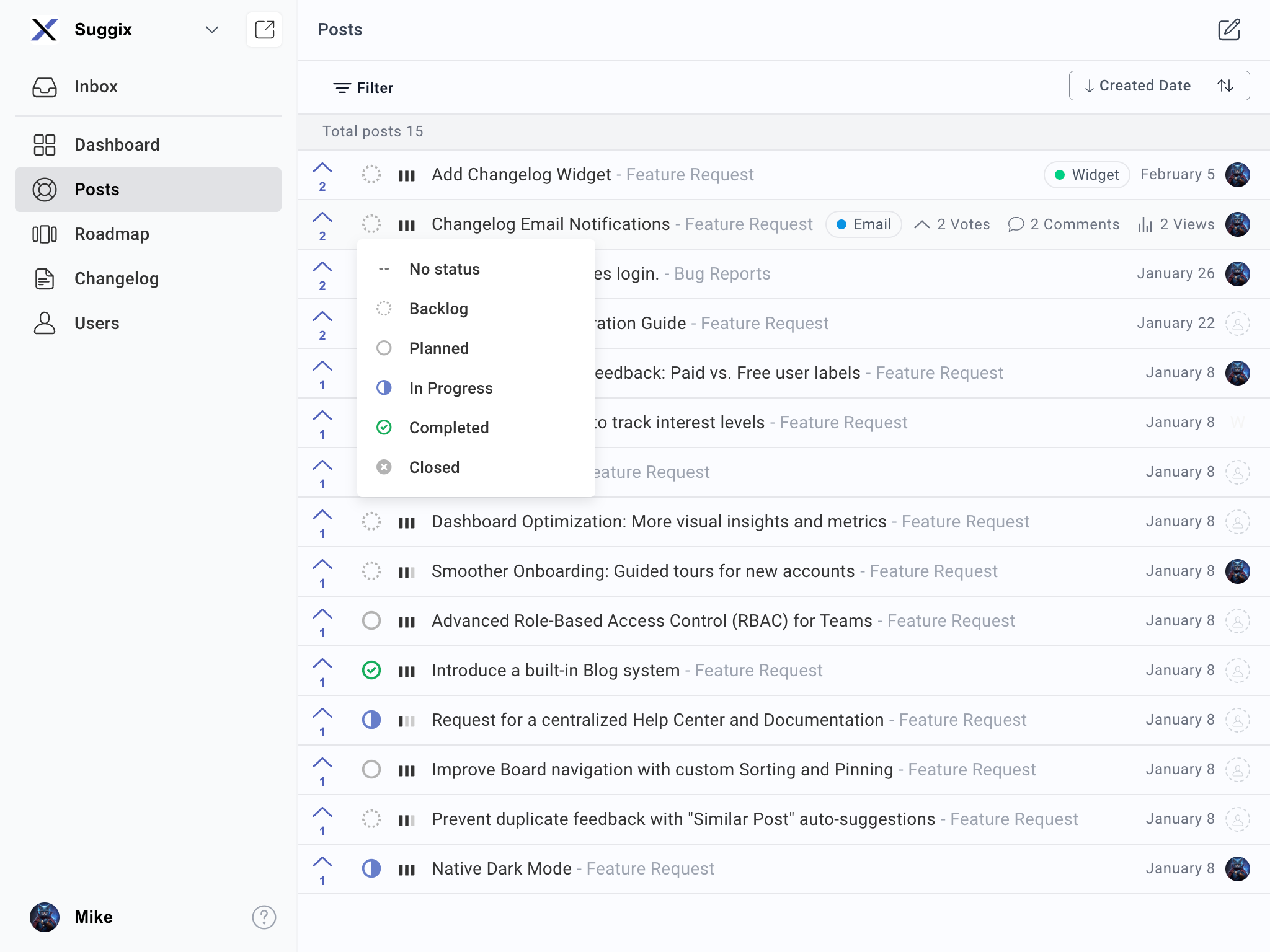 A feedback-driven roadmap doesn’t stop at planning; it requires closing the loop with users. Users should know that their input leads to tangible results. Suggix enables automatic notifications and changelogs, so users see when: